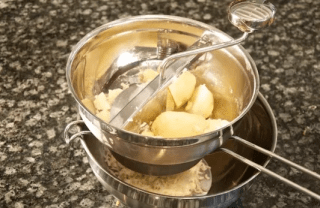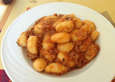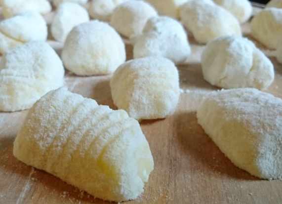 Cut this rope into 1 inch lengths. Take each bit of dough and flip it with your index finger against the inside of a fork (or if you have one, the special Rigagnocchi, or ‘gnocchi paddle’ pictured below, which you can find in some specialty food shops). This will cause the gnocchi to take on a concave shape with ridges on the outside, which will ‘catch’ any sauce you put on them.
