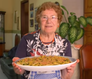 “You begin with a skillet and you use a light kind of olive oil and put in about 2 tbsp. full and put in 3 whole cloves of garlic. I usually puncture the cloves with a fork so it will exude the flavor I want. When the garlic is tanned or light brown take it out of the oil and throw it away. Keep the oil.” “For 4 people you can take 2 cans of the oval shaped tomato and you put each can in a blender and count about a “slow four” to grind it up and put it in a saucepan…do that with both cans. Add a pinch of salt and a little bit of black pepper and little bit of oregano…maybe ½ tsp. full. Add the oil. I used to watch my dad do it. He’d just take his fingers and he’d take so much and throw it in the pot. And you let it simmer.” … “Now…VERY IMPORTANT because this is what you don’t find in restaurants because they can’t take the time to do it. You take a good sized tsbp. And whatever oil or foreign matter that comes to the top; just keep skimming it until you have a pure red sauce. Low flame and cook for about ½ hr. and just let it sit there until you are ready to turn on your water for your pasta.” “You want to put a couple of bay leaves and fresh basil is wonderful…at the last minute.” “So you’ve got in the sauce olive oil, garlic, pepper, salt, oregano, a couple of basil leaves and, if you wish, a teaspoon – tablespoon. Of finely chopped parsley and that’s the way to make a simple pasta sauce.”
